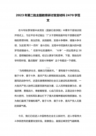 2023年第二批主题教育研讨发言材料2470字范文在今年秋季学期中央党校(国家行政学院)中青年干部培训班开班式上,习近平总书记指出“广大干部特别是年轻干部要经受严格的思想淬炼、政治历练、实践锻炼,发扬斗争精神,增强斗争本领,为实现'两个一百年’奋斗目标、实现中华民族伟大复兴的中国梦而顽强奋斗。”在新华社的通稿中,“斗争”一词出现多达58次,是明确的核心关键词。经过认真学习和思考,下面,我结合所学所思所悟,重点围绕”发扬斗争精神”这个专题谈一下感想。“为有牺牲多壮志,敢教日月换新天。”要有敢于斗争...