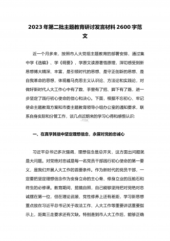 2023年第二批主题教育研讨发言材料2600字范文近一个月多来,按照市人大党组主题教育的部署安排,通过集中学《选编》、学《纲要》,学原文读原著悟原理,深切感受到新思想博大精深、丰富,是引领时代的思想、是守正创新的思想、是自我革命的思想,体现着马克思主义认识论、方法论和实践论,对做好新时代人大工作心中有了数、手里有了招、脚下有了路,进一步坚定了践行初心使命的信心和决心。下面,根据不忘初心、牢记使命主题教育方案和市委主题教育领导小组办公室的通知要求,联系自身实际和分管工作,谈几点近期来的学习心得和感...