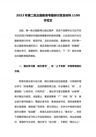 2023年第二批主题教育专题研讨发言材料1190字范文当前,第一批主题教育已接近尾声,党员干部要牢记习近平总书记在四川考察时所做的明确要求和具体部署,以实效为标尺对主题教育进行科学、客观评估,及时总结经验、查漏补缺,把好第一批主题教育收尾的关口,做足准备开启第二批主题教育“新篇章”,在理论学习、调查研究、推动发展上持续发力,下“万”般功夫推动主题教育提质增效。一、理论学习要“读万卷书”,在“上下求索”中用思想指引方向。思想态度决定行动力度,理论深度决定实践高度,只有做好理论学习“终身课题”,自觉...