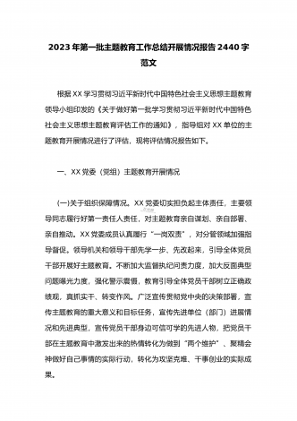 2023年第一批主题教育工作总结开展情况报告2440字范文根据XX学习贯彻习近平新时代中国特色社会主义思想主题教育领导小组印发的《关于做好第一批学习贯彻习近平新时代中国特色社会主义思想主题教育评估工作的通知》,指导组对XX单位的主题教育开展情况进行了评估,现将评估情况报告如下。一、XX党委(党组)主题教育开展情况(一)关于组织保障情况。XX党委切实担负起主体责任,主要领导同志履行好第一责任人责任,对主题教育亲自谋划、亲自部署、亲自推动。XX党委成员认真履行“一岗双责”,对分管领域加强指导督促。领...