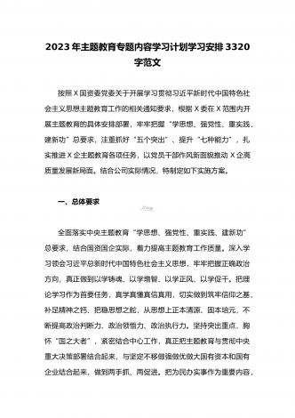2023年主题教育专题内容学习计划学习安排3320字范文按照X国资委党委关于开展学习贯彻习近平新时代中国特色社会主义思想主题教育工作的相关通知要求,根据X委在X范围内开展主题教育的具体安排部署,牢牢把握“学思想、强党性、重实践、建新功”总要求,注重抓好“五个突出”、提升“七种能力”,扎实推进X企主题教育各项任务,以党员干部作风新面貌推动X企高质量发展新局面。结合公司实际情况,特制定如下实施方案。一、总体要求全面落实中央主题教育“学思想、强党性、重实践、建新功”总要求,结合国资国企实际,着力提高主...