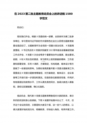 在2023第二批主题教育动员会上的讲话稿1580字范文同志们:现在我们开会。根据X党委的统一部署,全系统作为第二批参学单位,学习贯彻习近平新时代中国特色社会主义思想主题教育就要全面启动了。主题教育作为全党的一项重大政治任务,X党委高度重视,X书记先后在X党委庆祝建党102周年座谈会暨基层党建工作点评会、X党委X次全会等多个重要场合作出强调、提出要求。前期,X和X同志及时跟进、学习研究上级党委最新精神、工作进展和部署安排,在专X调研、方案制定、机构组建、载体设计等方面做了一些谋划和思考。为高标准高...