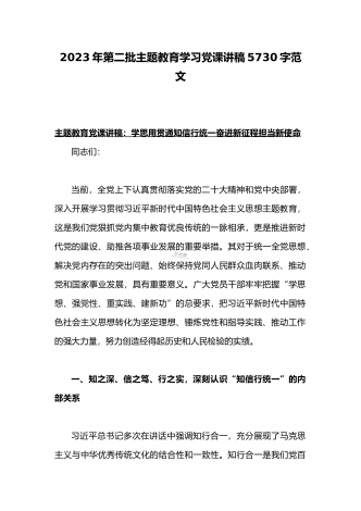 2023年第二批主题教育学习党课讲稿5730字范文主题教育党课讲稿:学思用贯通知信行统一奋进新征程担当新使命同志们:当前,全党上下认真贯彻落实党的二十大精神和党中央部署,深入开展学习贯彻习近平新时代中国特色社会主义思想主题教育,这是我们党狠抓党内集中教育优良传统的一脉相承,更是推进新时代党的建设、助推各项事业发展的重要举措。其对于统一全党思想、解决党内存在的突出问题、始终保持党同人民群众血肉联系、推动党和国家事业发展,具有重要意义。广大党员干部牢牢把握“学思想、强党性、重实践、建新功”的总要求,...