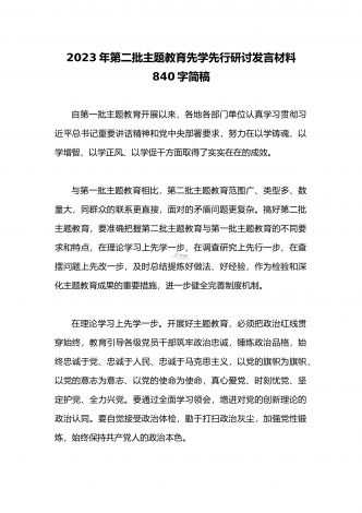 2023年第二批主题教育先学先行研讨发言材料840字简稿自第一批主题教育开展以来,各地各部门单位认真学习贯彻习近平总书记重要讲话精神和党中央部署要求,努力在以学铸魂、以学增智、以学正风、以学促干方面取得了实实在在的成效。与第一批主题教育相比,第二批主题教育范围广、类型多、数量大,同群众的联系更直接,面对的矛盾问题更复杂。搞好第二批主题教育,要准确把握第二批主题教育与第一批主题教育的不同要求和特点,在理论学习上先学一步、在调查研究上先行一步、在查摆问题上先改一步,及时总结提炼好做法、好经验,作为检...