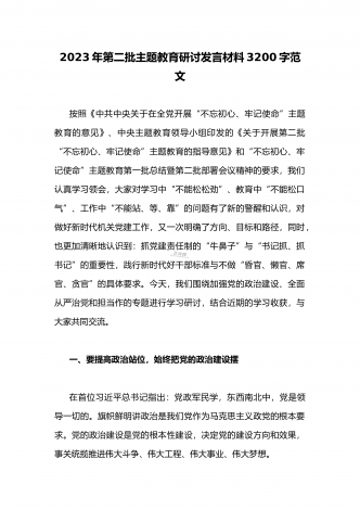 2023年第二批主题教育研讨发言材料3200字范文按照《中共中央关于在全党开展“不忘初心、牢记使命”主题教育的意见》、中央主题教育领导小组印发的《关于开展第二批“不忘初心、牢记使命”主题教育的指导意见》和“不忘初心、牢记使命”主题教育第一批总结暨第二批部署会议精神的要求,我们认真学习领会,大家对学习中“不能松松劲”、教育中“不能松口气”、工作中“不能站、等、靠”的问题有了新的警醒和认识,对做好新时代机关党建工作,又一次明确了方向、目标和路径,同时,也更加清晰地认识到:抓党建责任制的“牛鼻子”与“...