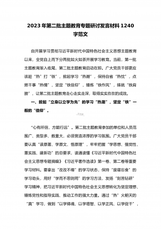 2023年第二批主题教育专题研讨发言材料1240字范文自开展学习贯彻习近平新时代中国特色社会主义思想主题教育以来,全党自上而下分两批如火如茶开展学习教育。当前,第一批主题教育渐入收尾,第二批主题教育启动在即。广大党员干部更应该趁“热”打“铁”,掀起学习“热潮”,保持自省“热忱”,点燃干事“热情”,坚定“铁信仰”,锤炼“铁作风”,铸就“铁肩膀”,让第二批主题教育走心走实走深,取得实实在在的成效。一、掀起“立身以立学为先”的学习“热潮”,坚定“铁”一般的“信仰”。“心有所信,方能行远”。第二批主题教...