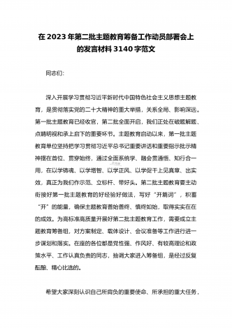 在2023年第二批主题教育筹备工作动员部署会上的发言材料3140字范文同志们:深入开展学习贯彻习近平新时代中国特色社会主义思想主题教育,是贯彻落实党的二十大精神的重大举措,关系全局、影响深远。第一批主题教育已经收官,第二批全面开启,我们正处在破题解题、点睛明视和承上启下的重要环节。主题教育启动以来,第一批主题教育单位坚持把学习贯彻习近平总书记重要讲话和重要指示批示精神摆在首位、贯穿始终,通过全面系统学、融会贯通悟、知行合一用,在以学铸魂、以学增智、以学正风、以学促干上见真章、出实效,真正为我们作...