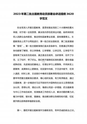 2023年第二批主题教育动员部署会讲话提纲3620字范文在全党深入开展主题教育,是贯彻落实党的二十大精神的重大举措,对于统一全党思想、解决党内存在的突出问题、始终保持党同人民群众血肉联系、推动党和国家事业发展,具有重要意义。主题教育自上而下分两批进行,第一批已经全面收官,第二批紧跟接棒“登场”。第一批主题教育我们虽未亲身参与,但是通过耳濡目染也能够了解到,在以学铸魂、以学增智、以学正风、以学促干方面取得了实实在在的成效,真正是走在前列、当好表率,在作了示范、立了标杆、带了好头。我们绝不能降低标准...