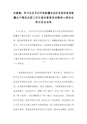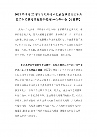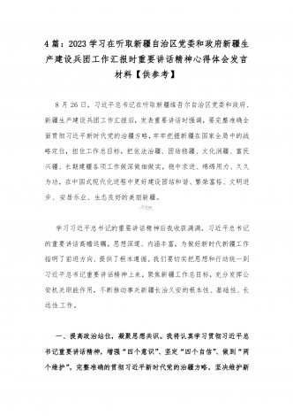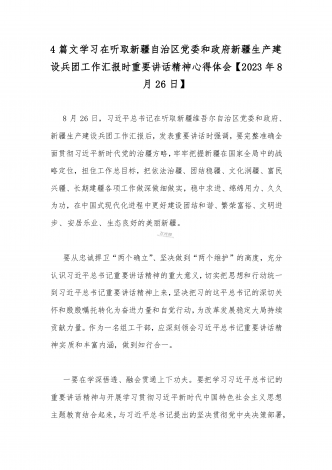 【2023年8月26日】全面学习在听取新疆自治区党委和政府新疆生产建设兵团工作汇报时重要讲话精神心得体会(4篇文)