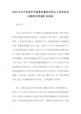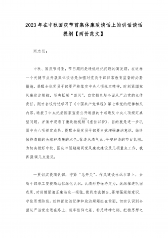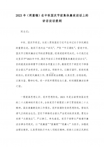 2023年在中秋国庆节前集体廉政谈话上的讲话谈话提纲【5篇】汇编供参考
