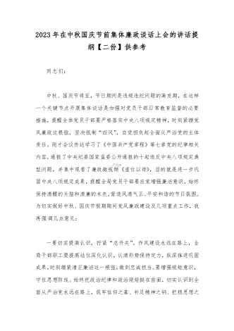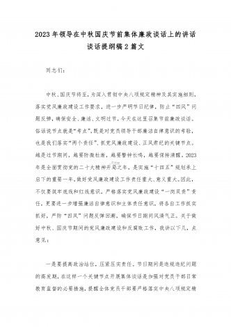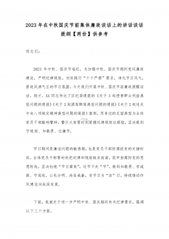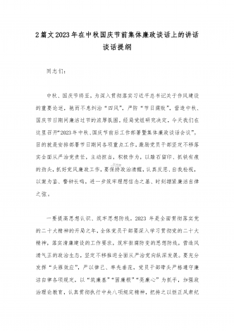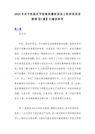 2023年在中秋国庆节前集体廉政谈话上的讲话谈话提纲【5篇】汇编供参考第一篇同志们:中秋、国庆节将至,节日期间往往是腐败易发时期,既是对党员领导干部廉洁自律意识的考验,也是落实“两个责任”、抓党风廉政建设、正风肃纪的关键点,越是逢年过节,越要防微杜渐,越要警钟长鸣,越要保持清醒。刚才,我们一起学习了中央八项规定精神、《中央纪委国家监委公开通报十起违反中央八项规定精神典型问题》等内容,观看了警示教育片X,以鲜活的案例为在座的每一位党员干部敲响节前警钟。而开展节前廉政谈话,也是在关键时间节点抓反腐倡...