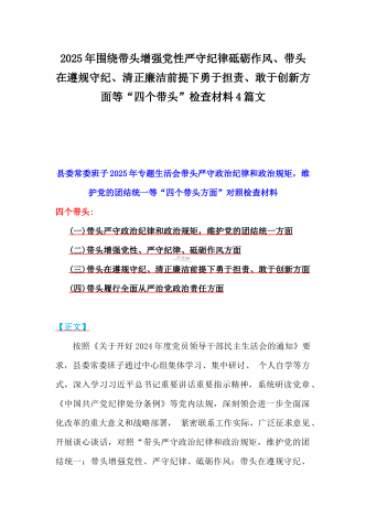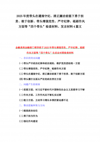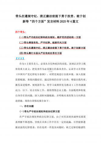 带头严守政治纪律和政治规矩,维护党的团结统一、带头在遵规守纪、清正廉洁前提下勇于担责、敢于创新等“四个方面”个人对照检查发言材料2025年4篇范文