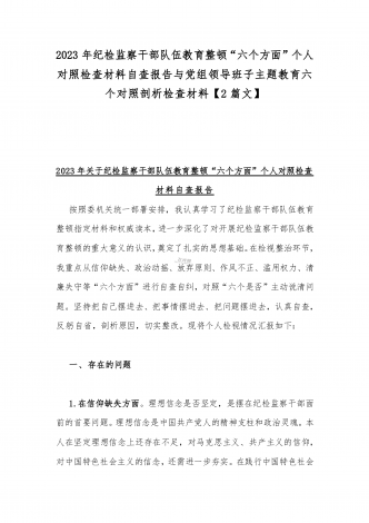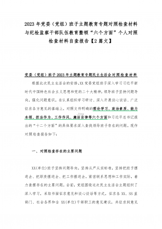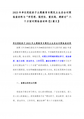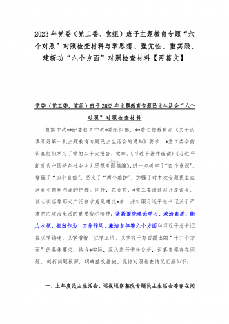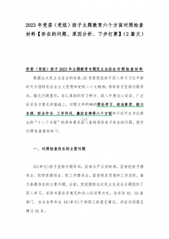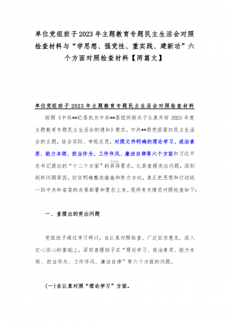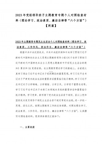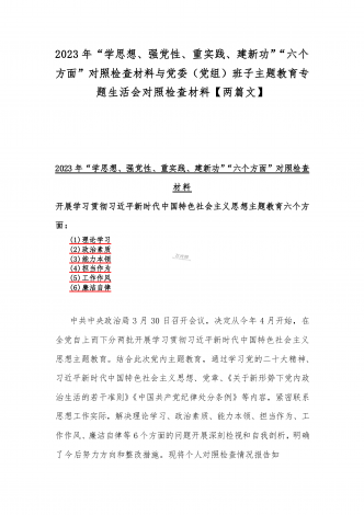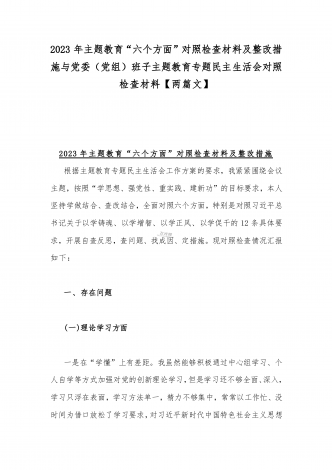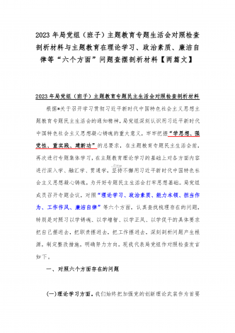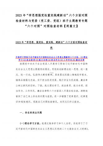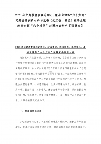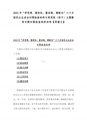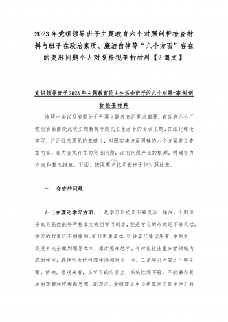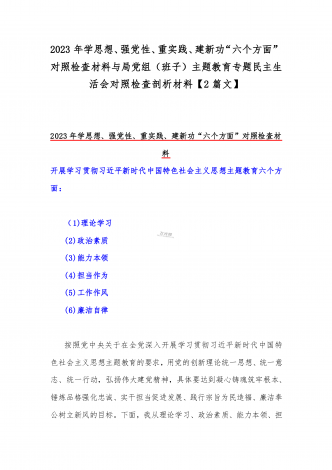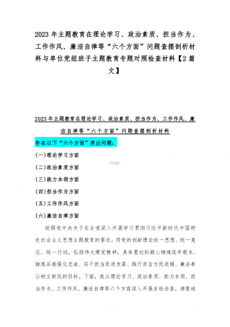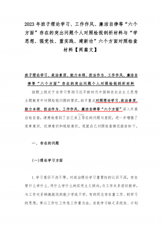 2023年班子理论学习、工作作风、廉洁自律等“六个方面”存在的突出问题个人对照检视剖析材料与“学思想、强党性、重实践、建新功”六个方面对照检查材料【两篇文】
