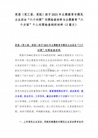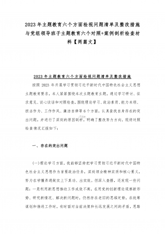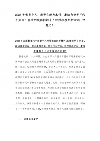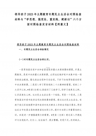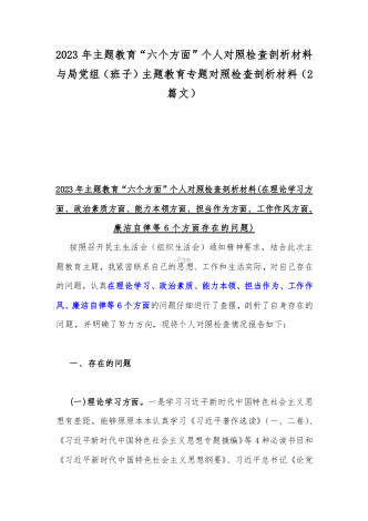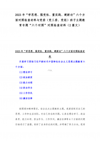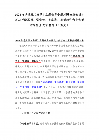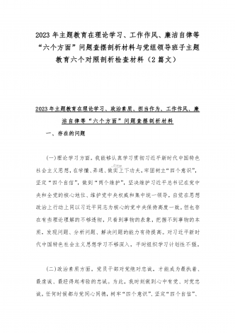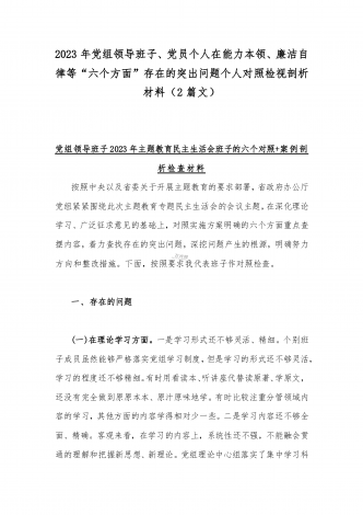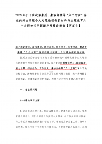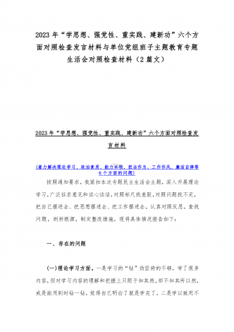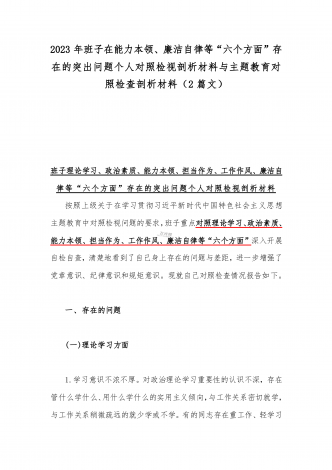 2023年“学思想、强党性、重实践、建新功”六个方面对照检查发言材料与班子在政治素质、廉洁自律等“六个方面”存在的突出问题个人对照检视剖析材料【两篇文】