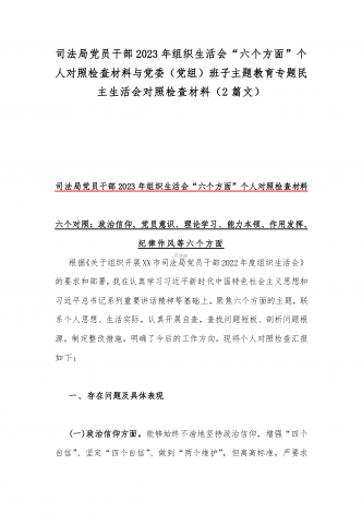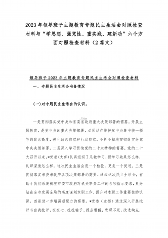 2023年“学思想、强党性、重实践、建新功”六个方面对照检查发言材料与班子在政治素质、廉洁自律等“六个方面”存在的突出问题个人对照检视剖析材料【两篇文】2023年“学思想、强党性、重实践、建新功”民主生活会六个方面对照检查发言材料按照2023年开展学习贯彻习近平新时代中国特色社会主义思想主题教育要求,本人紧紧围绕本次主题教育主题,通过学习研讨、征求意见、谈心谈话和对照检查,围绕理论学习、政治素质、能力本领、担当作为、工作作风、廉洁自律等6个方面,认真查找自身存在的突出问题,并进行了深刻的原因剖析...
