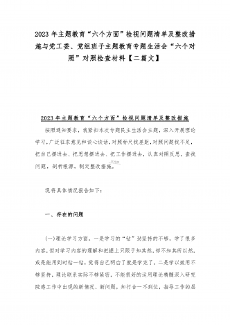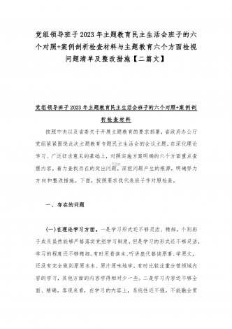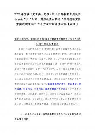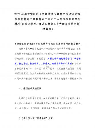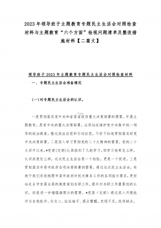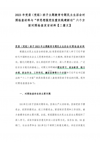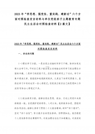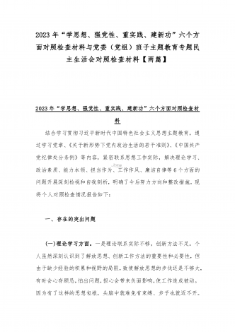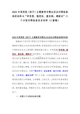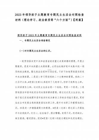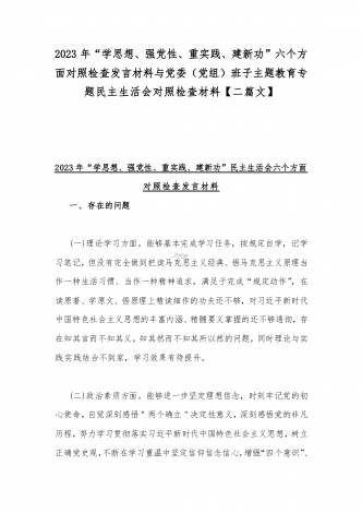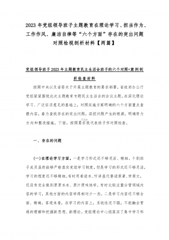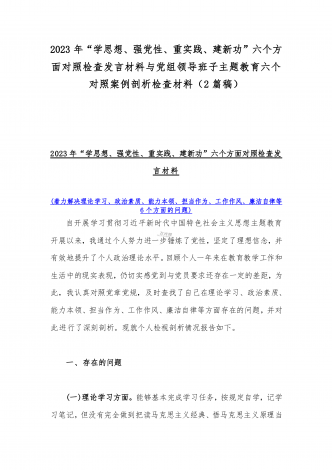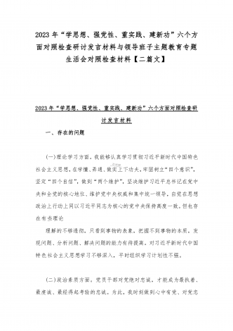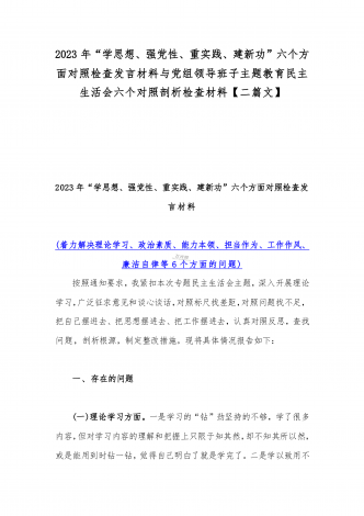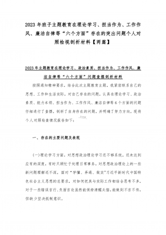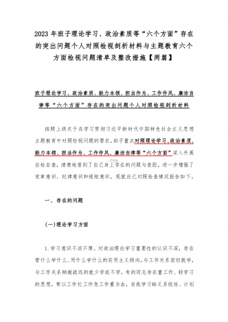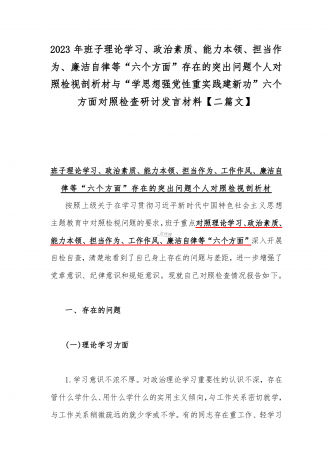 2023年班子理论学习、政治素质、能力本领、担当作为、廉洁自律等“六个方面”存在的突出问题个人对照检视剖析材与“学思想强党性重实践建新功”六个方面对照检查研讨发言材料【二篇文】