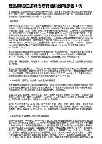 魏品康临证加减治疗脊髓脱髓鞘患者1例本院魏品康主任医师幼承家学,是军队师承制导师、上海市名中医,擅长用攻邪法治疗疑难疾病,“”主张邪去正自安。魏师根据疾病的不同阶段临证加减,攻补兼施,曾治疗1例脊髓脱髓鞘患者,收效甚佳。笔者有幸随诊,现介绍如下,以飨同道。1病历摘要患者,男,58岁,2003年3月15“日因左肩酸痛伴左上肢抬举无力5天,右下肢麻木3”天入我院神经内科。次日,颈肩部酸痛加重,出现左手抬举、持物不能,右下肢麻木感向上转移,左下肢行走无力,无头痛、眩晕、发热、咳嗽、恶心、呕吐等症状,精...