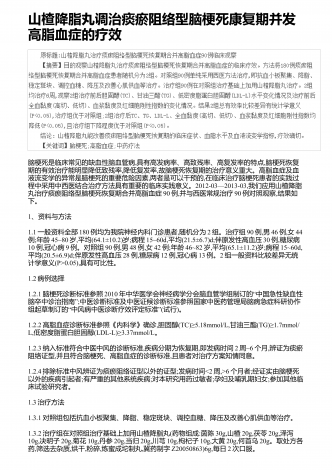 山楂降脂丸调治痰瘀阻络型脑梗死康复期并发高脂血症的疗效脑梗死是临床常见的缺血性脑血管病,具有高发病率、高致残率、高复发率的特点,脑梗死恢复期的有效治疗能明显降低致残率,降低复发率,故脑梗死恢复期的治疗意义重大。高脂血症及血液流变学的异常是脑梗死的重要危险因素,两者是可以干预的,在临床治疗脑梗死患者的实践过程中采用中西医结合治疗方法具有重要的临床实践意义。2012-03—2013-03,我们应用山楂降脂丸治疗痰瘀阻络型脑梗死恢复期合并高脂血症90例,并与西医常规治疗90例对照观察,结果如下。1、资...