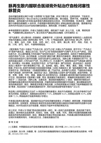 脉再生散内服联合医顽膏外贴治疗血栓闭塞性脉管炎血栓闭塞性脉管炎属于中医"十指零落"与"脱疽"范畴,多发于青壮年,且男性居多,下肢多见,具体病因目前尚无一致认识.较为公认的诱因为烟草过敏、寒冷潮湿、营养不良、性腺激素、细菌感染、遗传因素与外伤等.临床表现为患肢皮肤怕冷发凉、存在营养障碍、色泽改变、间歇性跛行与静息性疼痛等.30余年来,作者根据中医的辨证理念,研制出脉再生散内服、医顽膏外贴此种内外同治的方法治疗血栓闭塞性脉管炎,病例完整,疗效确切,现报告如下.参考祖国医学文献资料,作者认为脱疽之病因...