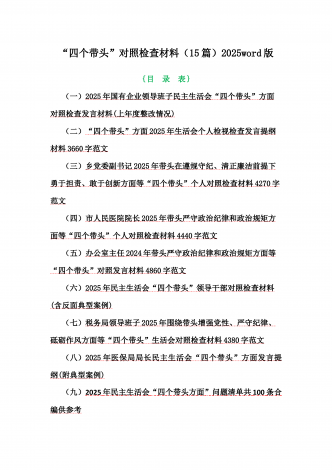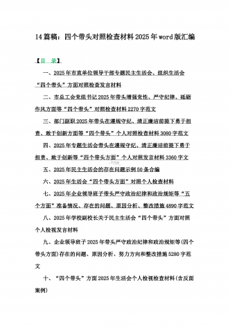 2025年围绕专题生活会带头严守政治纪律和政治规矩,维护党的团结统一等“四个带头”检查材料13篇word文【可参考编辑选用】(目录)1.国有企业党委书记“四个带头”方面2025年生活会个人检视检查材料2.带头在遵规守纪、清正廉洁前提下勇于担责、敢于创新方面存在问题【12条】合编3.分管农业副乡长2025年在带头严守政治纪律和政治规矩方面等“四个带头”个人对照检查发言材料5690字范文4.2025年专题生活会对照带头增强党性、严守纪律、砥砺作风等“四个带头方面”个人对照检查发言材料5.2025年专...