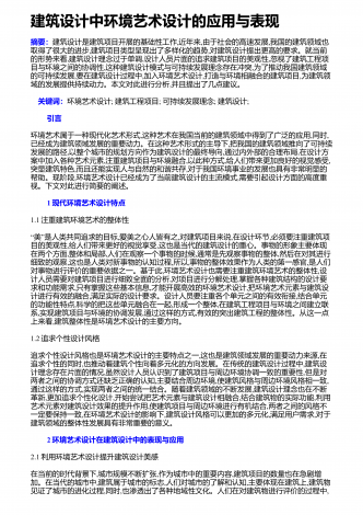 建筑设计中环境艺术设计的应用与表现摘要:建筑设计是建筑项目开展的基础性工作,近年来,由于社会的高速发展,我国的建筑领域也取得了很大的进步,建筑项目类型呈现出了多样化的趋势,对建筑设计提出更高的要求。就当前的形势来看,建筑设计理念过于单调,设计人员片面的追求建筑项目的美观性,忽视了建筑工程项目与环境之间的协调性,这种建筑设计模式与可持续发展理念存在冲突,为了推动我国建筑领域的可持续发展,要在建筑设计过程中,加入环境艺术设计,打造与环境相融合的建筑项目,为建筑领域的发展提供持续动力。本文对此进行分析...