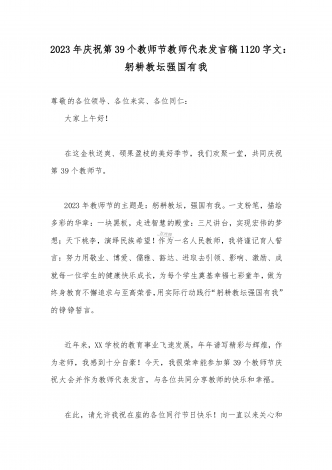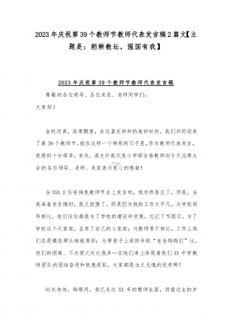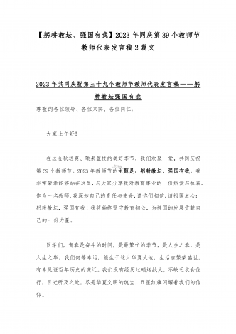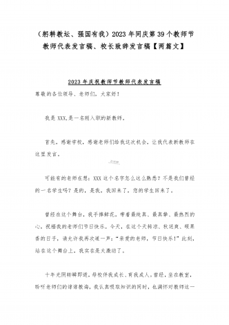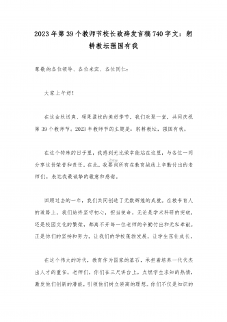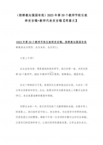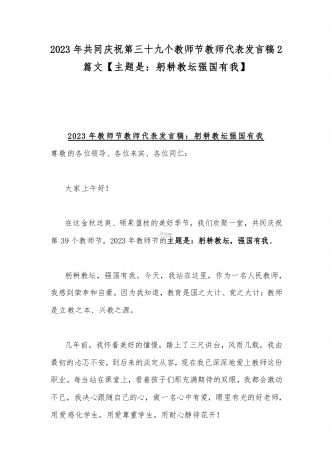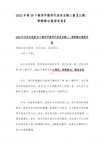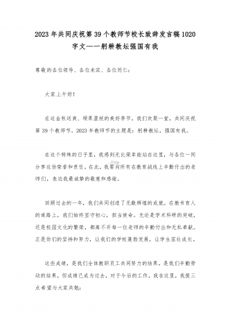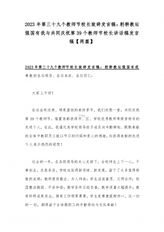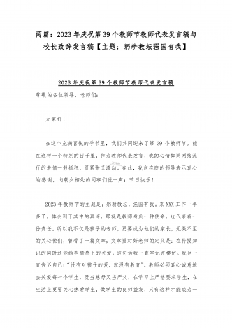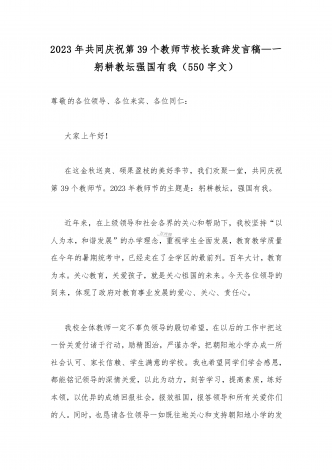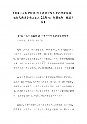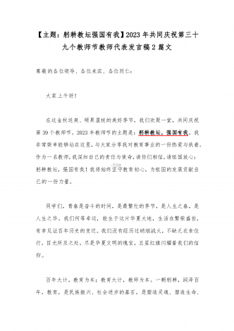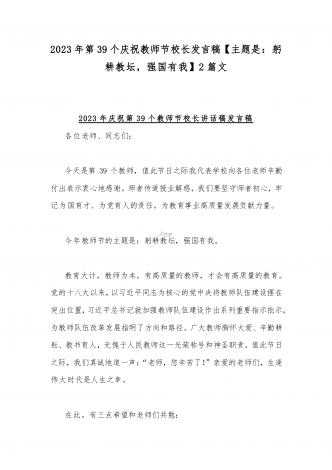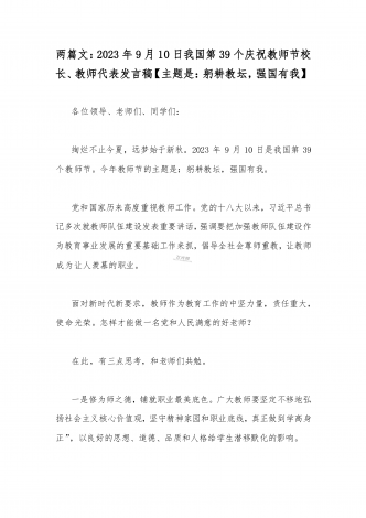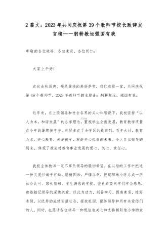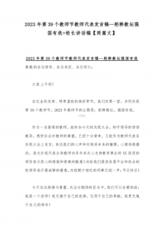 2023年第三十九个教师节校长致辞发言稿:躬耕教坛强国有我与共同庆祝第39个教师节校长讲话稿发言稿【两篇】