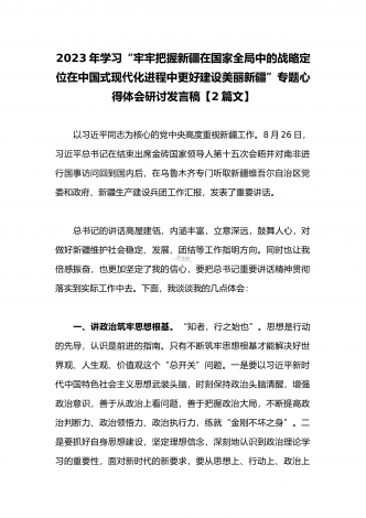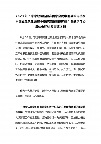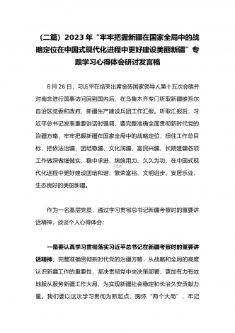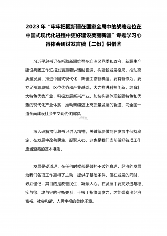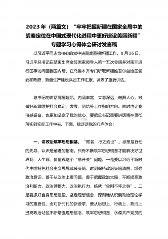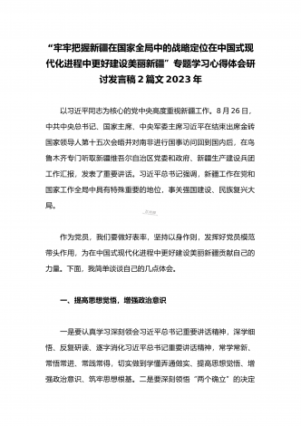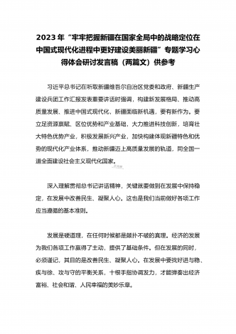 2023年“牢牢把握新疆在国家全局中的战略定位在中国式现代化进程中更好建设美丽新疆”专题学习心得体会研讨发言稿(两篇文)供参考