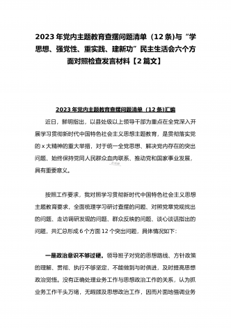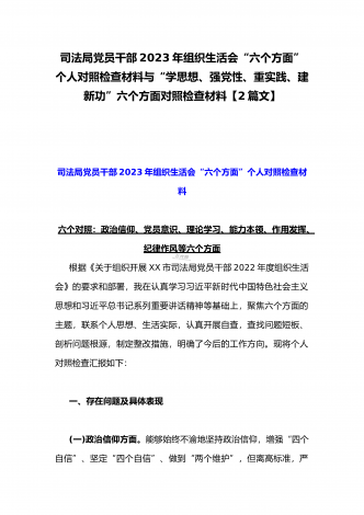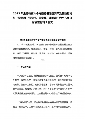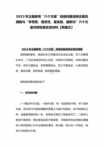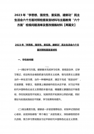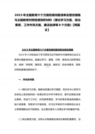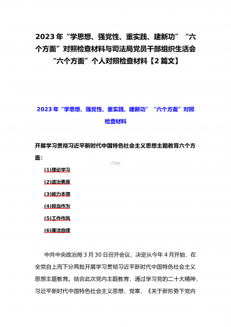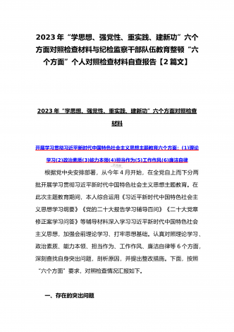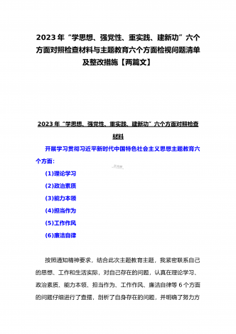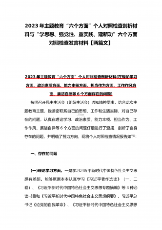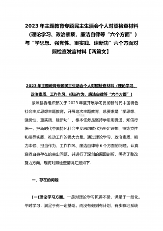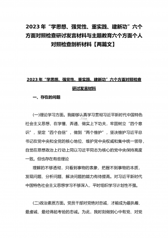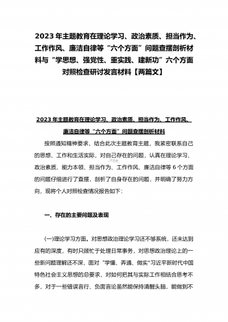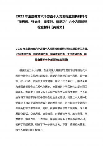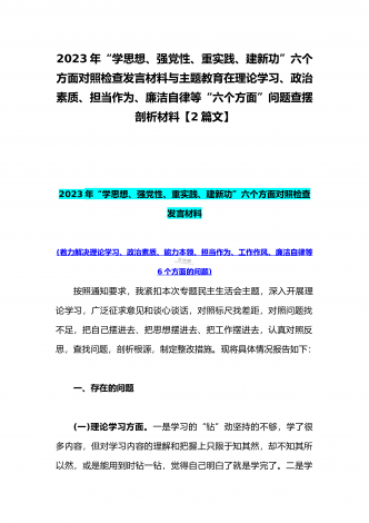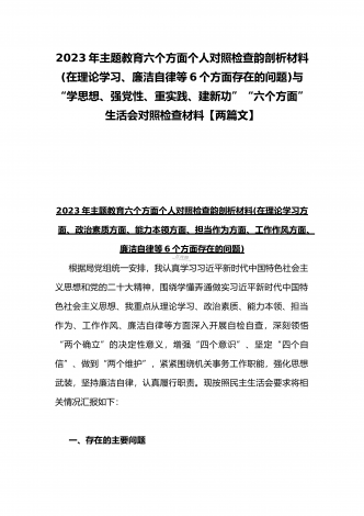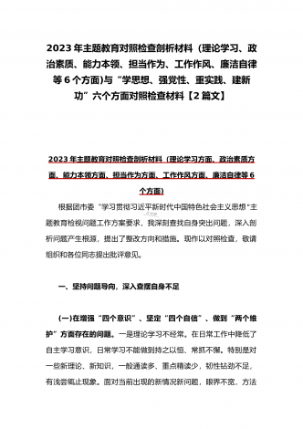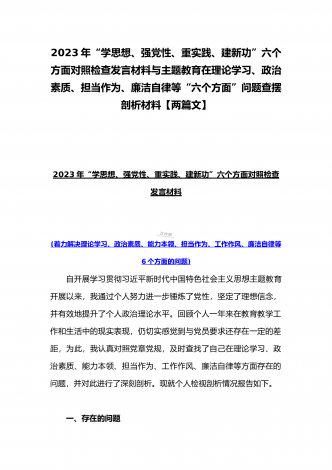 2023年主题教育对照检查剖析材料(理论学习、政治素质、能力本领、担当作为、工作作风、廉洁自律等6个方面)与“学思想、强党性、重实践、建新功”六个方面对照检查材料【2篇文】