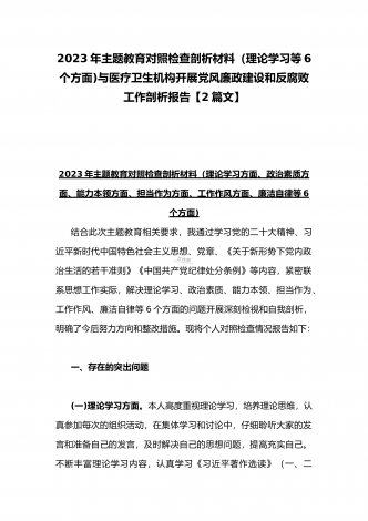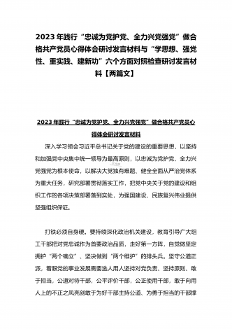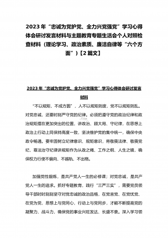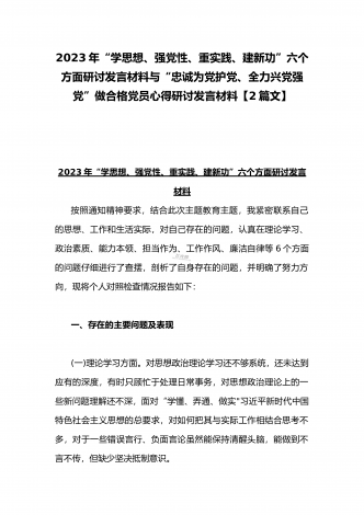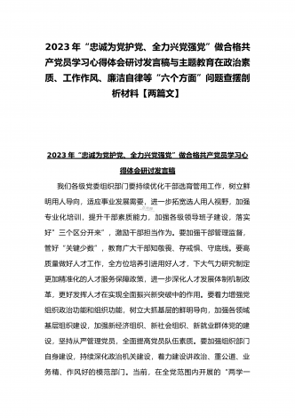 2023年主题教育在政治素质、工作作风、廉洁自律等“六个方面”问题查摆剖析材料与践行“忠诚为党护党、全力兴党强党”做合格共产党员心得体会研讨发言材料【两篇文】