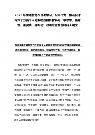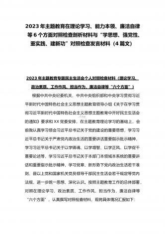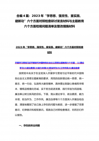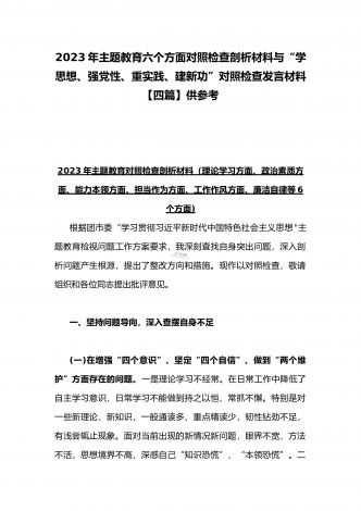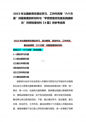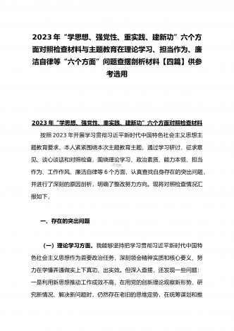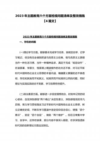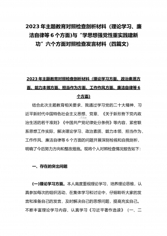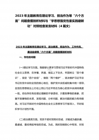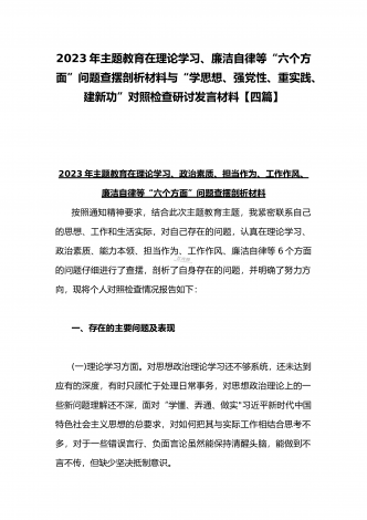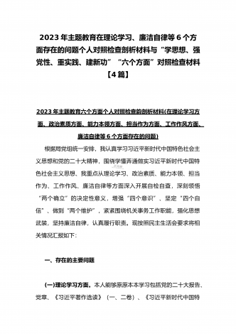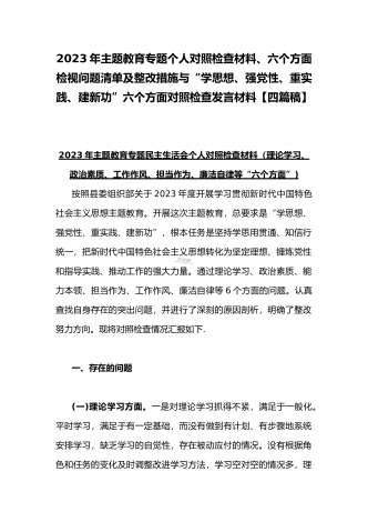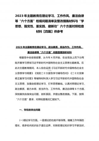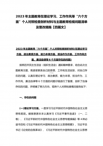 2023年主题教育在理论学习、工作作风、廉洁自律等“六个方面”检视问题清单及整改措施材料与“学思想、强党性、重实践、建新功”六个方面对照检查材料【四篇】供参考