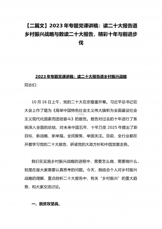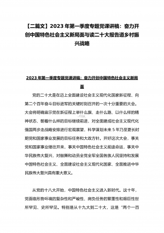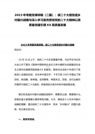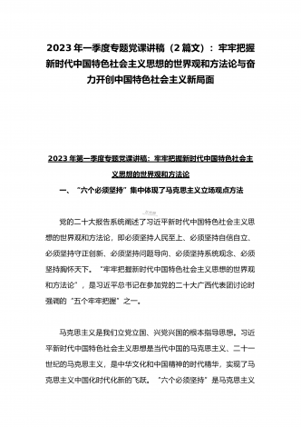2023年专题党课讲稿(二篇):衷心拥护“两个确立”忠诚践行“两个维护”以中国式现代化全面推进中华民族伟大复兴与坚定不移推进全面从严治党,以实际行动践行新时代新担当新作为2023年专题党课讲稿:衷心拥护“两个确立”忠诚践行“两个维护”以中国式现代化全面推进中华民族伟大复兴2022年10月16日上午10时,中国共产党第二十次全国代表大会在北京人民大会堂隆重召开。习近平总书记代表第十九届中央委员会,向大会作了题为《高举中国特色社会主义伟大旗帜,为全面建设社会主义现代化国家而团结奋斗》的报告。会场内,...