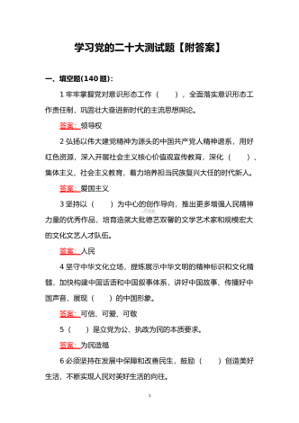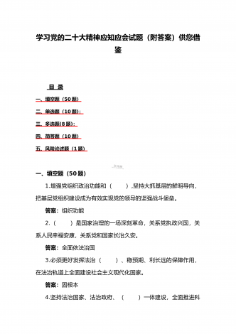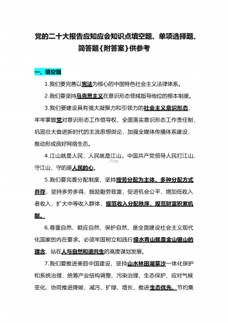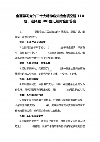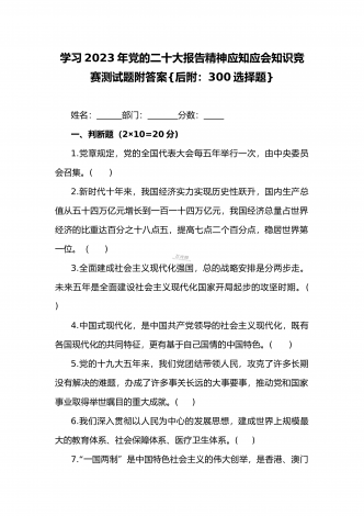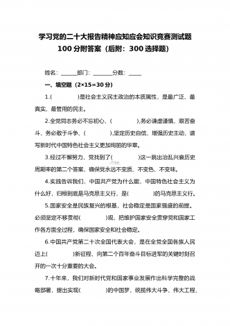 学习党的二十大报告精神应知应会知识竞赛测试题100分附答案(后附:300选择题)姓名:部门:分数:一、填空题(2×15=30分)1.()是社会主义民主政治的本质属性,是最广泛、最真实、最管用的民主。2.全党同志务必不忘初心、(),务必谦虚谨慎、艰苦奋斗,务必敢于斗争、(),坚定历史自信,增强历史主动,谱写新时代中国特色社会主义更加绚丽的华章。3.经过不懈努力,党找到了()这一跳出治乱兴衰历史周期率的第二个答案,确保党永远不变质、不变色、不变味。4.实践告诉我们,中国共产党为什么能,中国特色社会主...