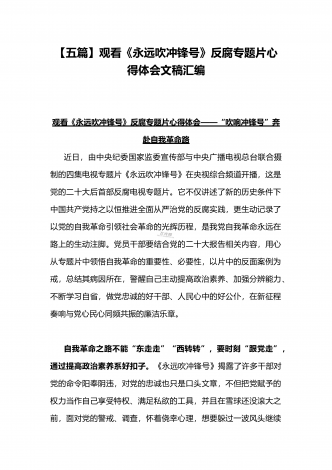 观看《永远吹冲锋号》反腐专题片心得体会1320字稿:用《永远吹冲锋号》绘就“廉洁画像”近日,中央纪委国家监委宣传部与中央广播电视总台联合摄制的四集电视专题片《永远吹冲锋号》在央视综合频道热播,这是党的二十大后首部反腐电视专题片。该片通过《第二个答案》《政治监督》《铁规矩硬杠杠》《永远在路上》四个篇章,生动讲述了新的历史条件下中国共产党持之以恒推进全面从严治党、以党的自我革命引领社会革命的光辉历程。广大党员干部应用《永远吹冲锋号》绘就忠诚、奉献、干净的“廉洁画像”,以昂扬的姿态、坚毅的步伐,奋力走...