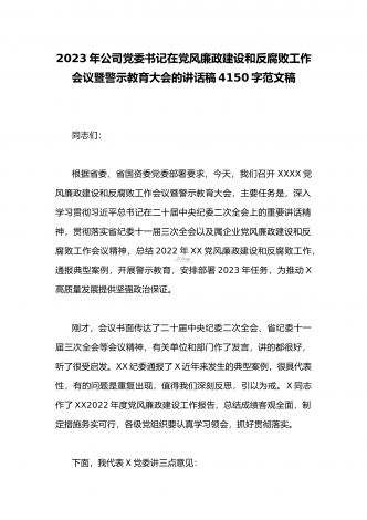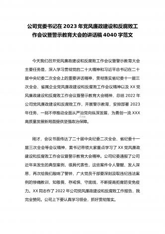 2023年公司党委书记在党风廉政建设和反腐败工作会议暨警示教育大会的讲话稿4150字范文稿同志们:根据省委、省国资委党委部署要求,今天,我们召开XXXX党风廉政建设和反腐败工作会议暨警示教育大会,主要任务是,深入学习贯彻习近平总书记在二十届中央纪委二次全会上的重要讲话精神,贯彻落实省纪委十一届三次全会以及属企业党风廉政建设和反腐败工作会议精神,总结2022年XX党风廉政建设和反腐败工作,通报典型案例,开展警示教育,安排部署2023年任务,为推动X高质量发展提供坚强政治保证。刚才,会议书面传达了二...