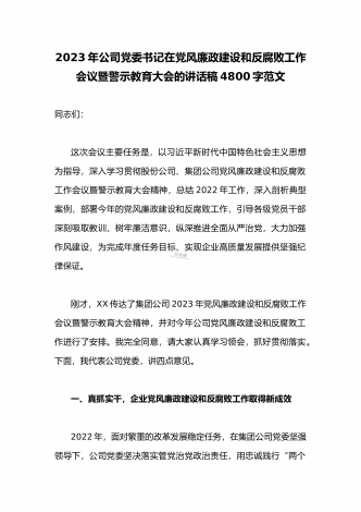 2023年公司党委书记在党风廉政建设和反腐败工作会议暨警示教育大会的讲话稿4150字范文稿