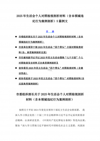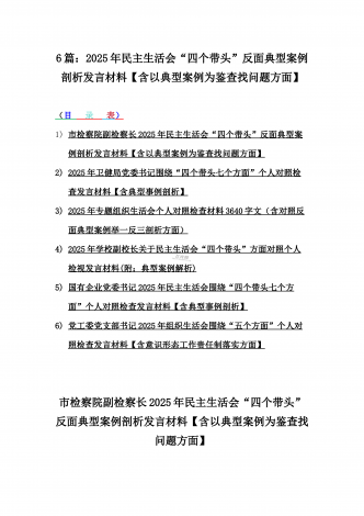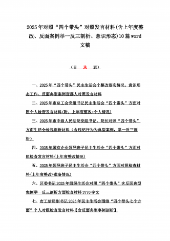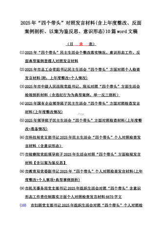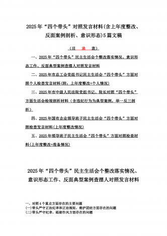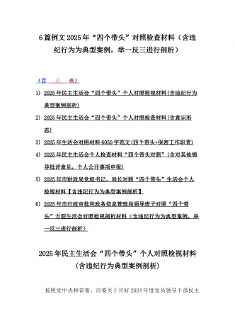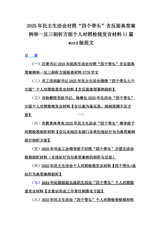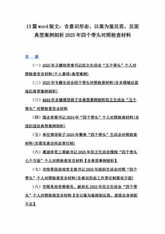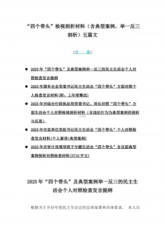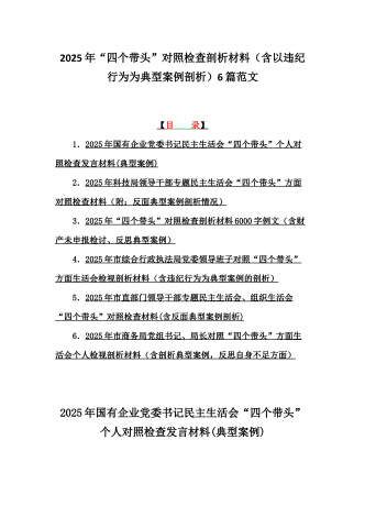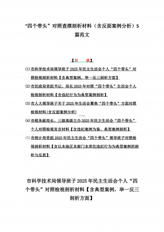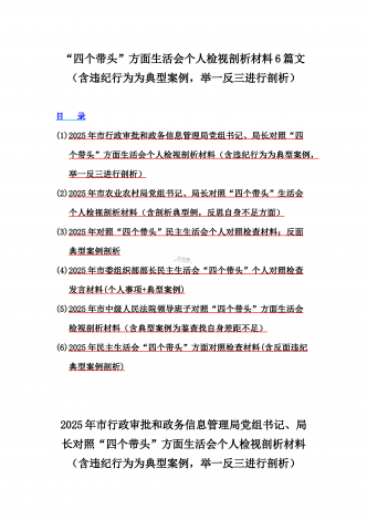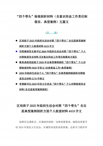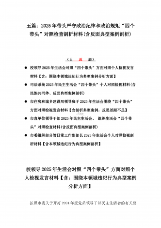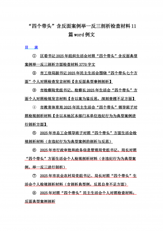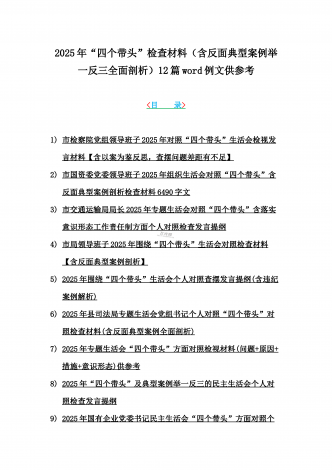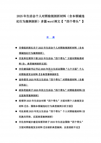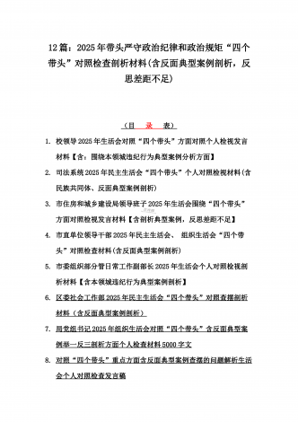 12篇:2025年带头严守政治纪律和政治规矩“四个带头”对照检查剖析材料(含反面典型案例剖析,反思差距不足)(目录表)1.校领导2025年生活会对照“四个带头”方面对照个人检视发言材料【含:围绕本领城违纪行为典型案例分析方面】2.司法系统2025年民主生活会“四个带头”个人对照检视材料(含民族共同体、反面典型案例剖析)3.市住房和城乡建设局领导班子2025年生活会围绕“四个带头”方面对照检视发言材料【含剖析典型案例,反思差距不足】4.市直单位领导干部2025年民主生活会、组织生活会“四个带头”对...