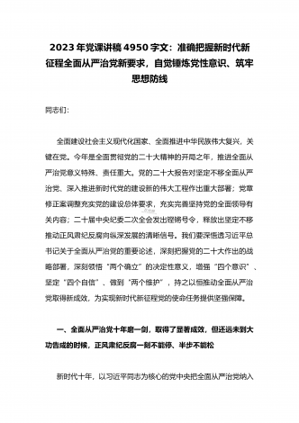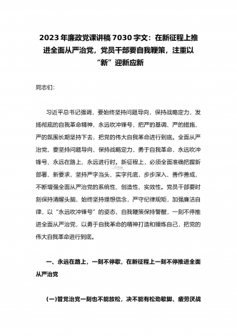 2023年廉政党课讲稿7030字文:在新征程上推进全面从严治党,党员干部要自我鞭策,注重以“新”迎新应新