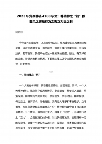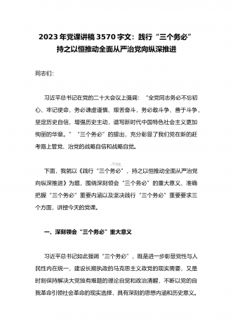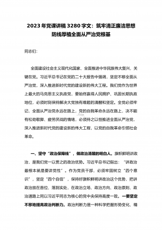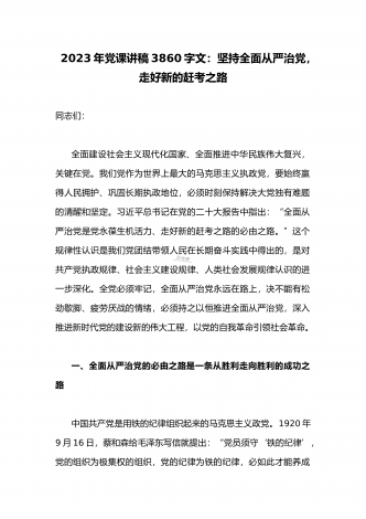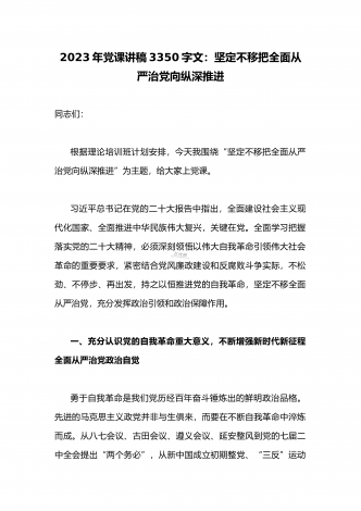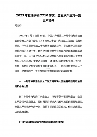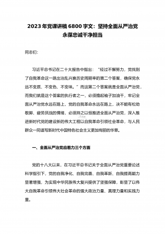 2023年廉政党课讲稿7030字文:在新征程上推进全面从严治党,党员干部要自我鞭策,注重以“新”迎新应新同志们:习近平总书记强调,要始终坚持问题导向,保持战略定力,发扬彻底的自我革命精神,永远吹冲锋号,把严的基调、严的措施、严的氛围长期坚持下去,把党的伟大自我革命进行到底。全面从严治党,要坚持问题导向,保持战略定力,勇于自我革命,永远吹冲锋号、永远在路上、永远进行时。新征程上,必须全面准确把握新部署、新要求,坚持严字当头、实字托底,步步深入、善作善成,不断增强全面从严治党的系统性、创造性、实效性...