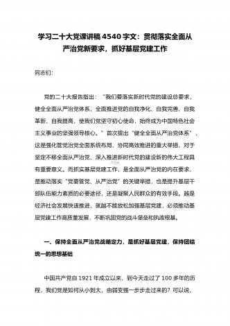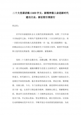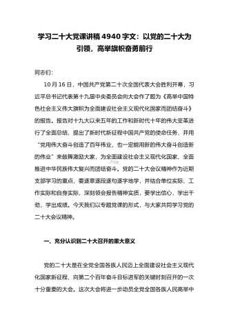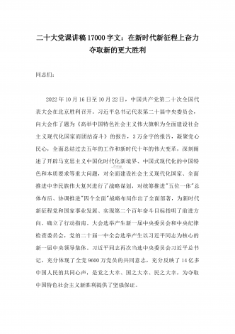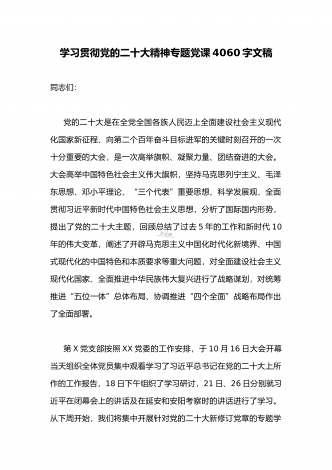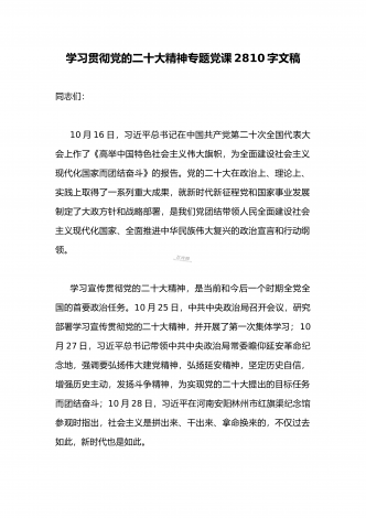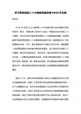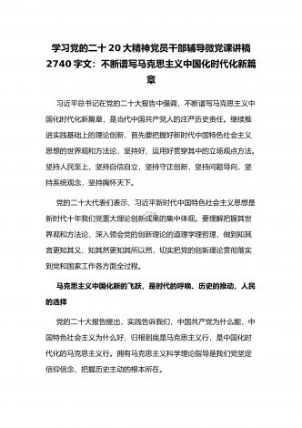 学习党的二十20大精神党员干部辅导微党课讲稿2740字文:不断谱写马克思主义中国化时代化新篇章习近平总书记在党的二十大报告中强调,不断谱写马克思主义中国化时代化新篇章,是当代中国共产党人的庄严历史责任。继续推进实践基础上的理论创新,首先要把握好新时代中国特色社会主义思想的世界观和方法论,坚持好、运用好贯穿其中的立场观点方法。坚持人民至上,坚持自信自立,坚持守正创新,坚持问题导向,坚持系统观念,坚持胸怀天下。党的二十大代表们表示,习近平新时代中国特色社会主义思想是新时代十年我们党重大理论创新成果的...