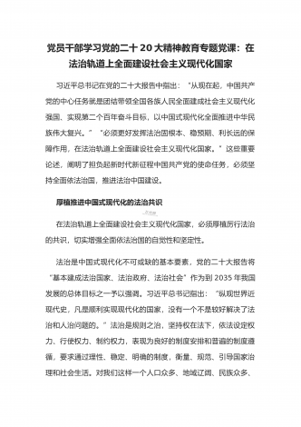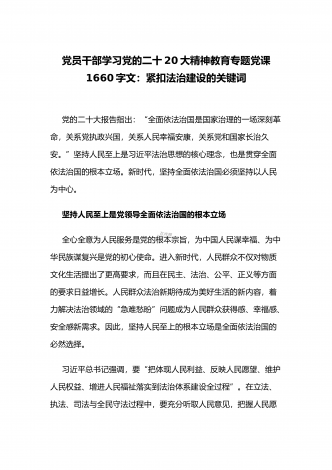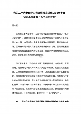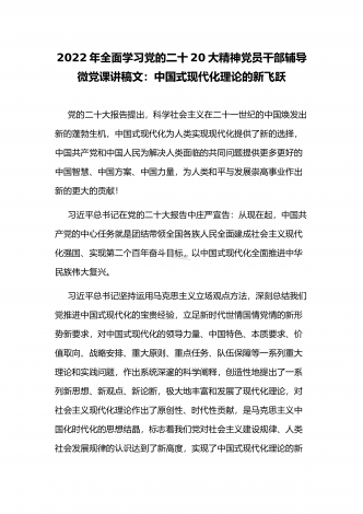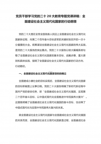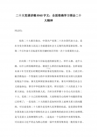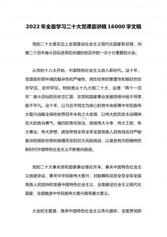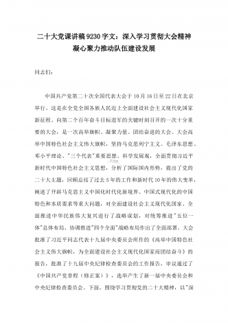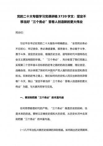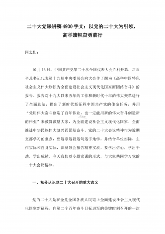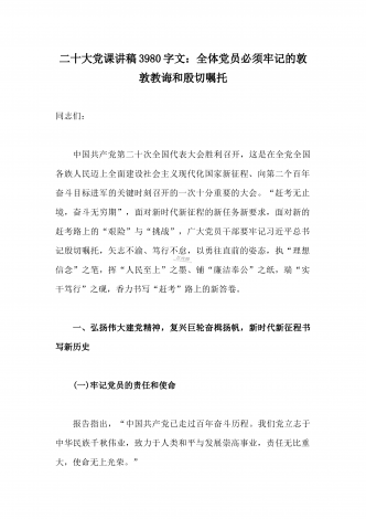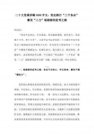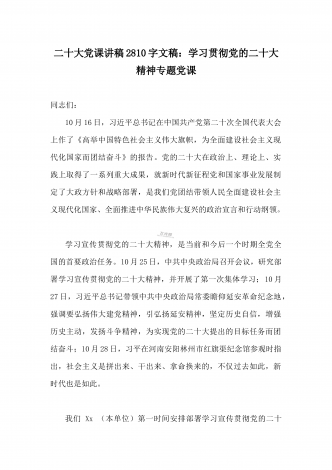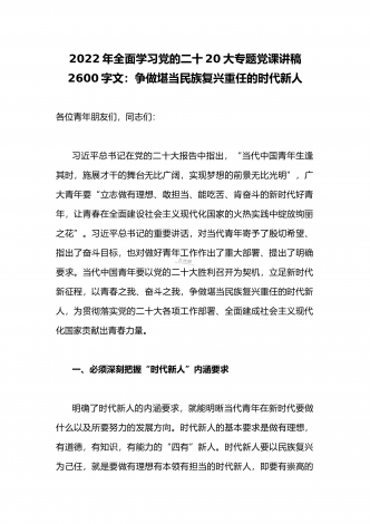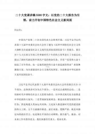 2022年全面学习党的二十20大专题党课讲稿3030字文:发扬自我革命与敢于斗争精神,在新征程上展现新担当同志们:刚刚召开的二十大,是在全党全国各族人民迈上全面建设社会主义现代化国家新征程、向第二个百年奋斗目标进军的关键时刻召开的一次十分重要的大会。大会明确宣示了党在新征程上举什么旗、走什么路、以什么样的精神状态、朝着什么样的目标继续前进,对团结和激励全国各族人民为夺取中国特色社会主义新胜利而奋斗具有十分重大的意义。全面建设社会主义现代化国家、全面推进中华民族伟大复兴,关键在党。习近平总书记在二...