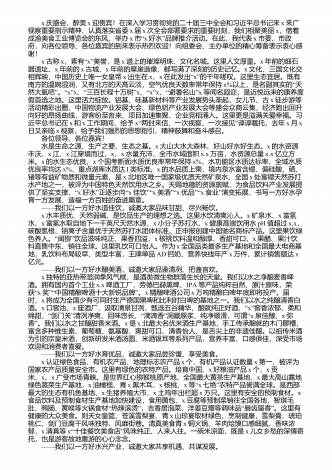 食品产业是国民经济的支柱产业,是事关人民群众幸福安康的民生产业。x市坚持以习近“”“”平新时代中国特色社会主义思想为指导,站位四强行动大局,围绕三城五地建设目标,立足陇上江南和接陕通川的生态、区位优势,着力推动体现地域特色的食品产业高质量发展。我们的主要做法是: “”一、注重集约化布局,聚集食品产业发展的势能 坚持高位布局,统筹谋划,市委、市政府把食品产业发展当作拉动农业增值、带动工业进步、推动服务业提升和乡村振兴建设的突破口来抓,在确定的十三条产业链中,白酒、油橄“”榄、花椒、核桃、茶...