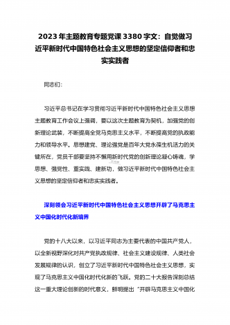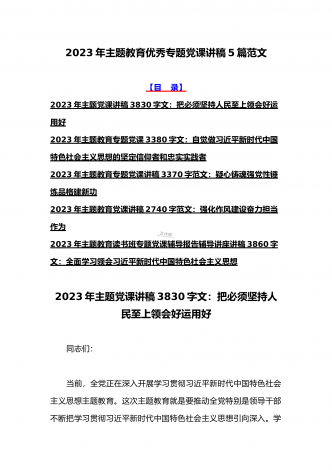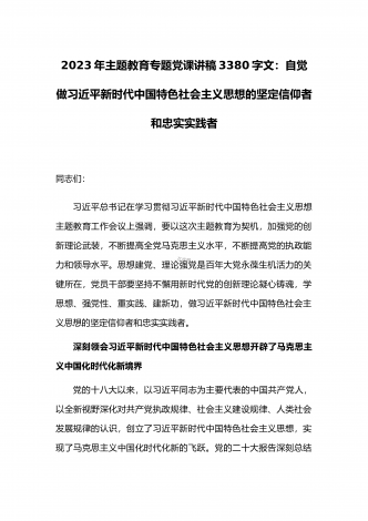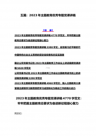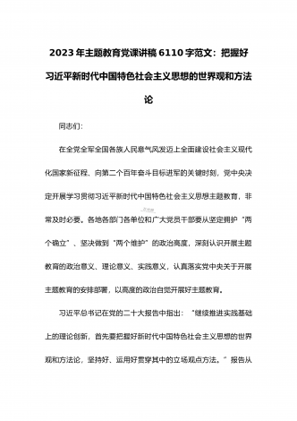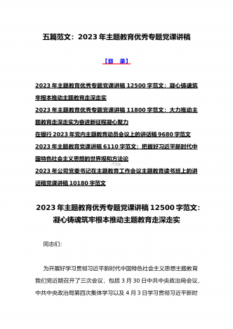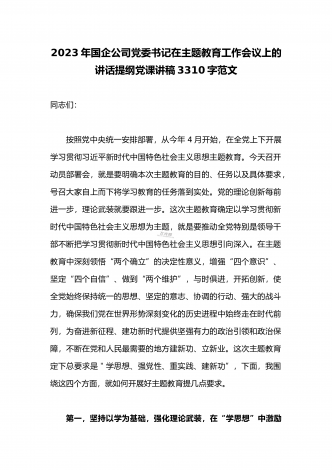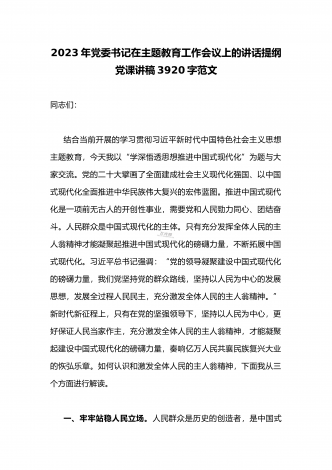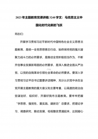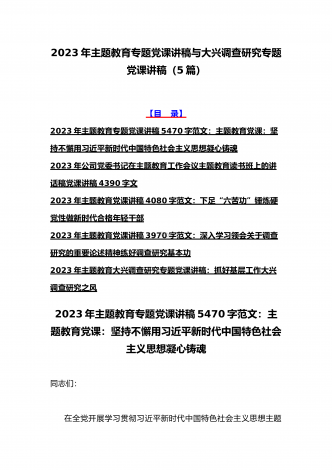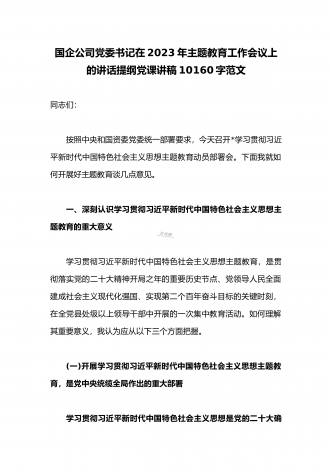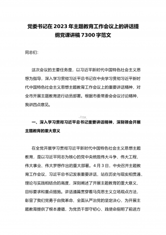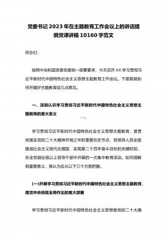 2023年在主题教育专题工作会议上的讲话提纲党课讲稿【8篇】与在学习贯彻主题教育动员部署会议上的讲话稿(6篇)汇编供参考【目录】2023年主题教育党课讲稿:马克思主义中国化时代化新的飞跃2023年党委书记在主题教育工作会议上的讲话提纲党课讲稿2023年主题教育专题党课讲稿4960字范文:融人主题教育大课堂倾注感情学习新思想把学习成效转化为推动工作的强大动力党委书记2023年在主题教育工作会议上的讲话提纲党课讲稿2023年主题教育专题党课讲稿6510字范文:感悟思想伟力凝聚奋进力量全力推动主题教育...