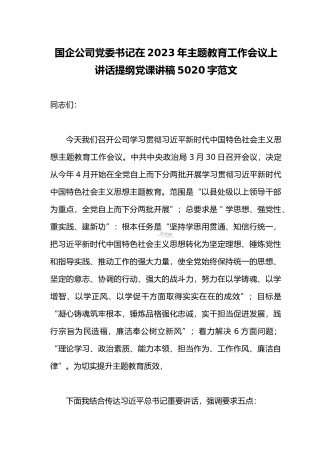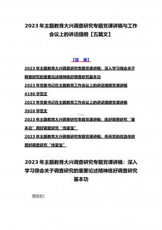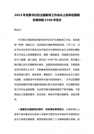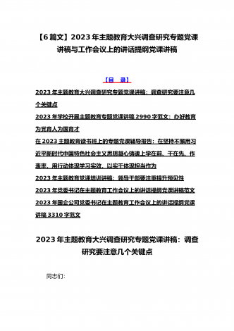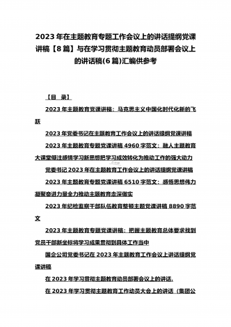 2023年在主题教育专题工作会议上的讲话提纲党课讲稿【8篇】与在学习贯彻主题教育动员部署会议上的讲话稿(6篇)汇编供参考