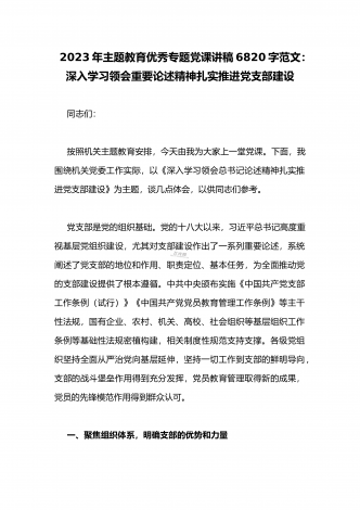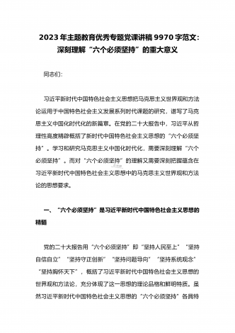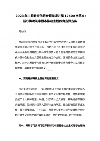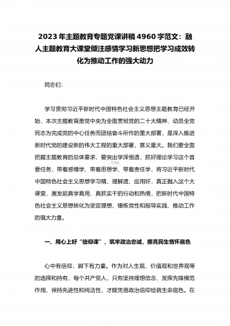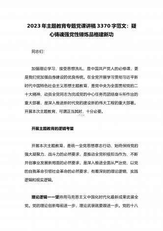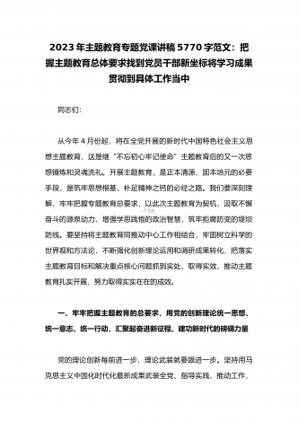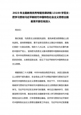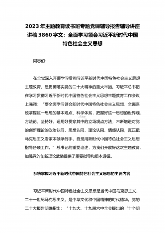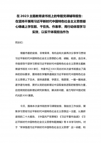 在2023主题教育读书班上的专题党课辅导报告:在坚持不懈用习近平新时代中国特色社会主义思想凝心铸魂上学在前、干在先、作表率,用行动体现学习实效,以实干体现担当作为同志们:根据市委的安排,非常荣幸,有机会和大家再次分享学习贯彻习近平新时代中国特色社会主义思想的心得、感触、收获。连日来,市级领导干部学习贯彻习近平新时代中国特色社会主义思想主题教育读书班在XXX举行,市委书记XXX同志对本次读书班提出了具体的目标要求,要持续在学懂弄通做实习近平新时代中国特色社会主义思想上下功夫,坚持读原著、学原文、悟...