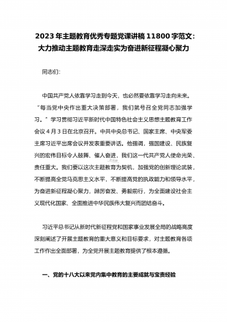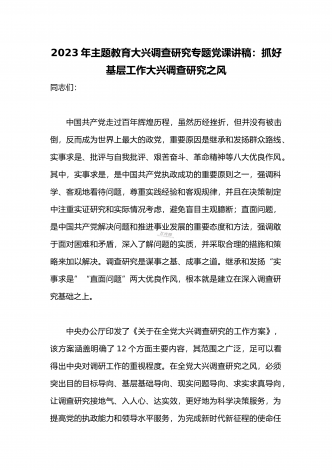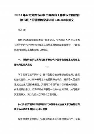 2023年主题教育读书班专题党课辅导报告辅导讲座讲稿6790字文:把握习近平新时代中国特色社会主义思想核心内容坚持好运用好贯穿其中的立场观点方法同志们:学习贯彻习近平新时代中国特色社会主义思想主题教育已全面开启。开展主题教育是今年党的建设的重大任务。我们要按照主题教育“学思想、强党性、重实践、建新功”总体要求,把加强理论武装作为重中之重,引导广大党员干部读原著学原文悟原理,全面学习领会习近平新时代中国特色社会主义思想的科学体系、精髓要义、实践要求。坚持不懈用习近平新时代中国特色社会主义思想凝心铸...