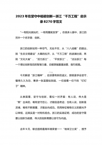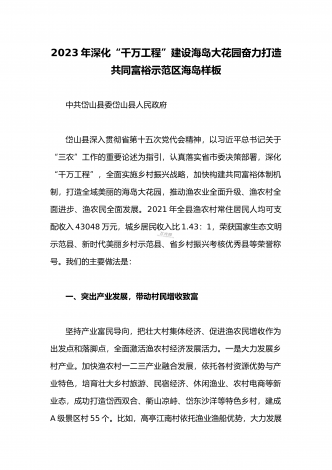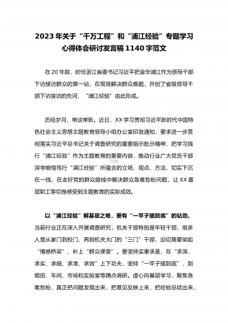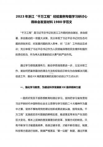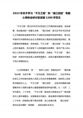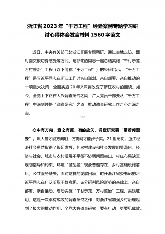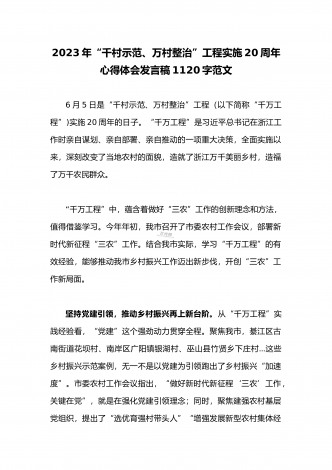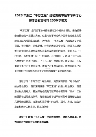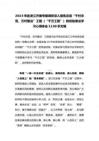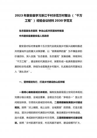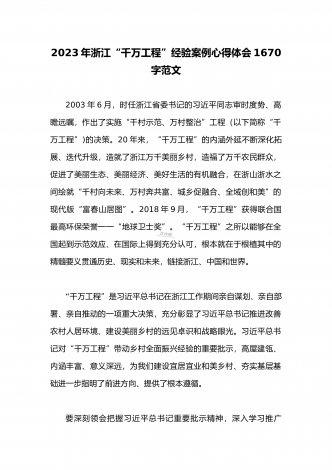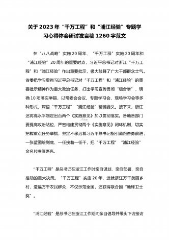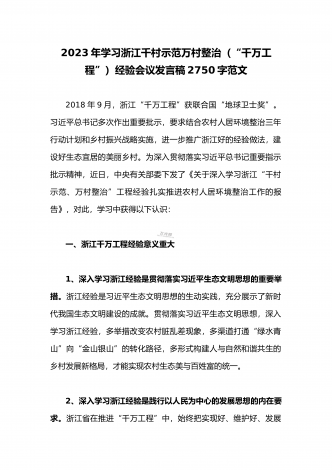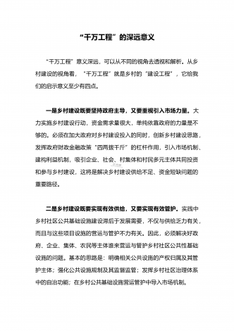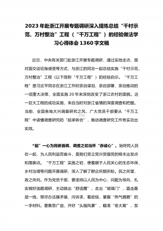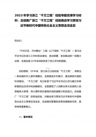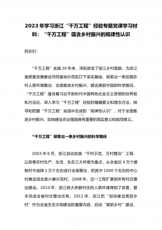 2023年学习浙江“千万工程”经验专题党课学习材料:总结推广浙江“千万工程”经验推动学习贯彻习近平新时代中国特色社会主义思想走深走实同志们:“千村示范、万村整治”工程(以下简称“千万工程”)是习近平总书记在浙江工作时亲自谋划、亲自部署、亲自推动的一项重大决策,全面实施20年来深刻改变了浙江农村的面貌。总的感到,20年来,浙江持之以恒实施“千万工程”,探索出一条加强农村人居环境整治、全面推进乡村振兴、建设美丽中国的科学路径。“千万工程”充分彰显了习近平总书记以非凡魄力开辟新路的远见卓识和战略眼光,...