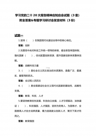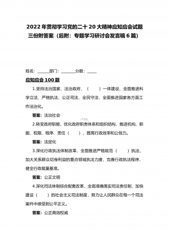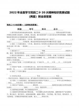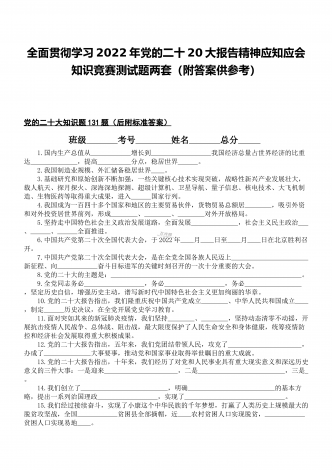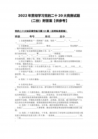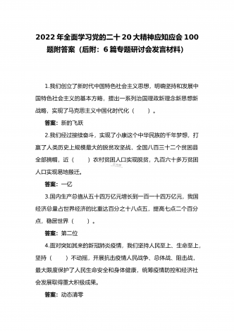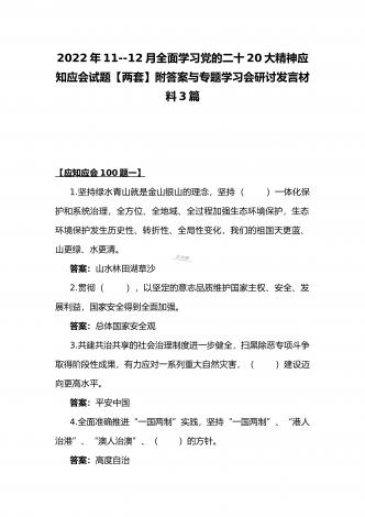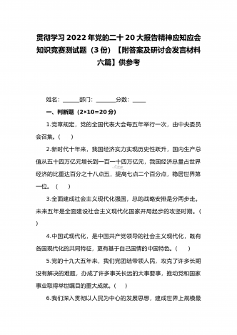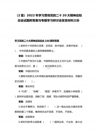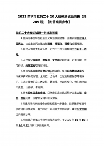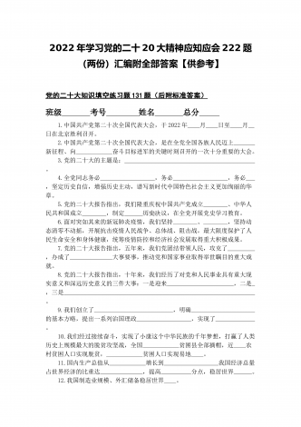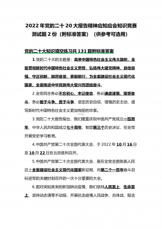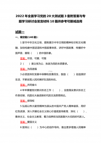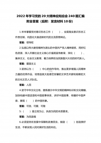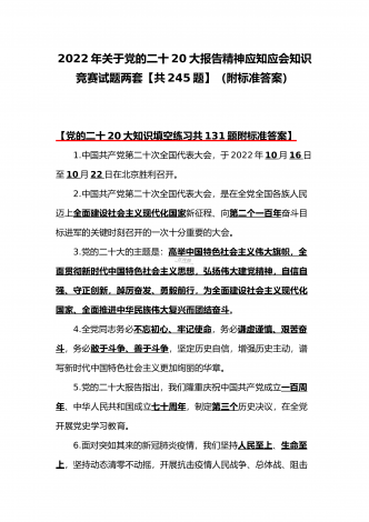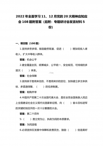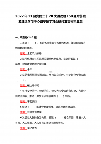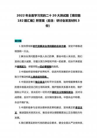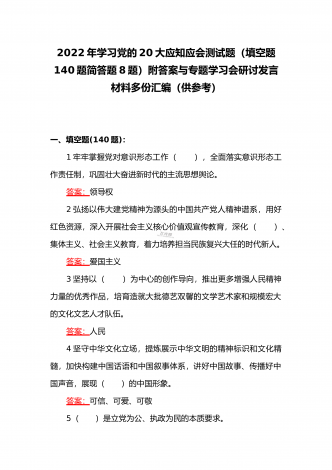 2022年第四季度全面学习党的二十20大精神应知应会142题附答案【供参考】&党委理论学习中心组专题研讨会发言材料3份填空题:1.牢牢掌握党对意识形态工作(),全面落实意识形态工作责任制,巩固壮大奋进新时代的主流思想舆论。答案:领导权2.弘扬以伟大建党精神为源头的中国共产党人精神谱系,用好红色资源,深入开展社会主义核心价值观宣传教育,深化()、集体主义、社会主义教育,着力培养担当民族复兴大任的时代新人。答案:爱国主义3.坚持以为()中心的创作导向,推出更多增强人民精神力量的优秀作品,培育造就大批...