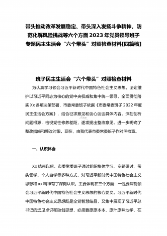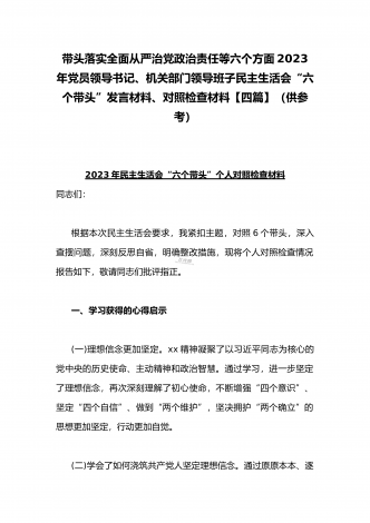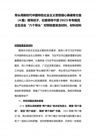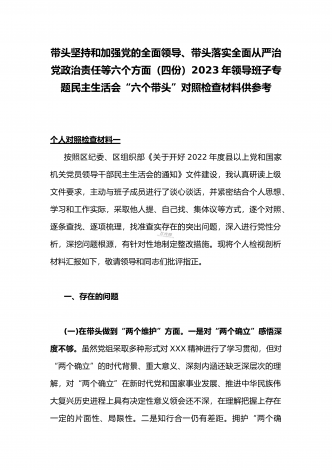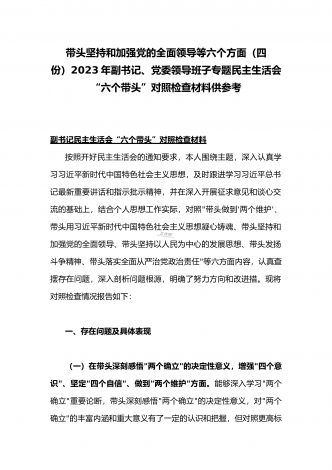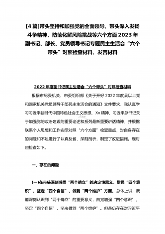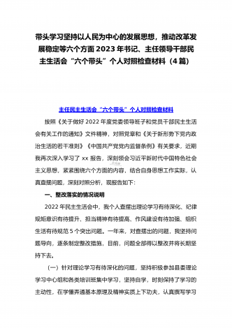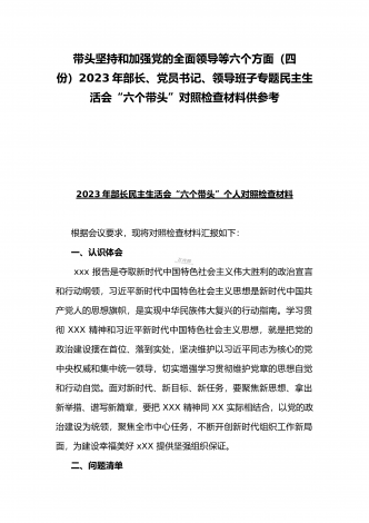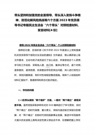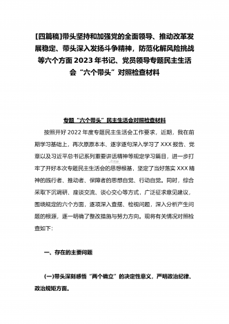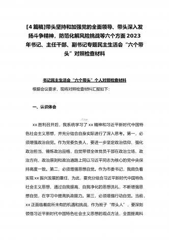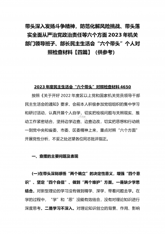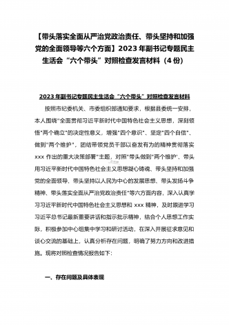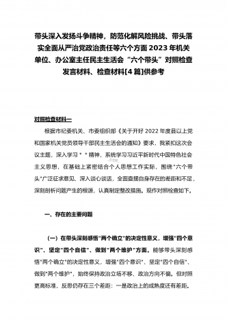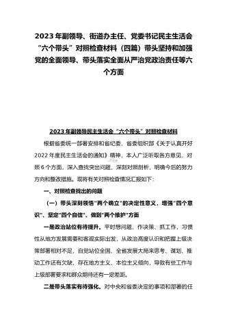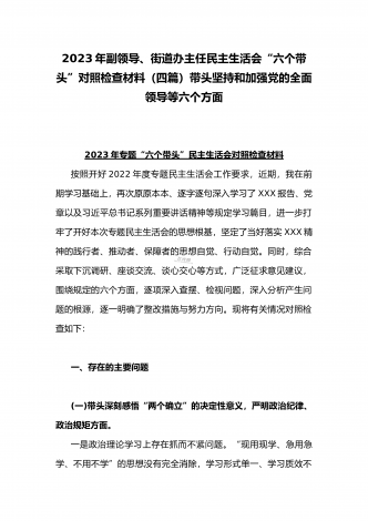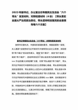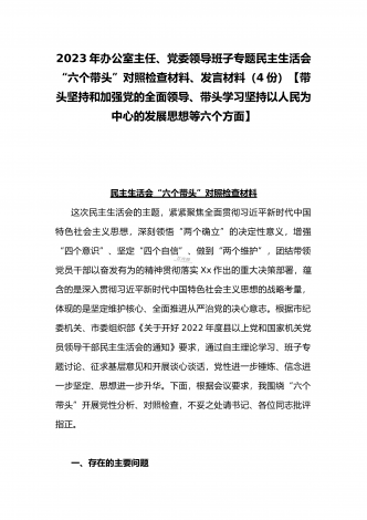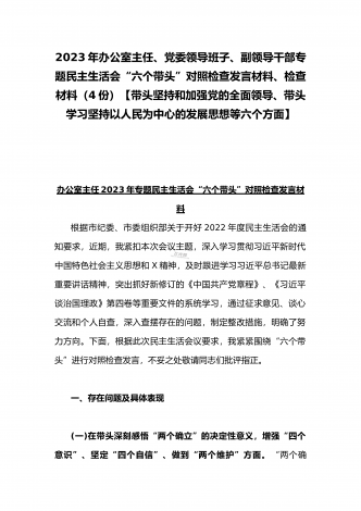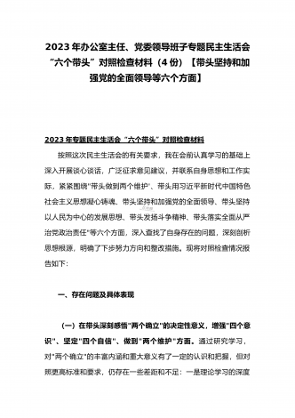 2023年办公室主任、党委领导班子、副领导干部专题民主生活会“六个带头”对照检查发言材料、检查材料(4份)【带头坚持和加强党的全面领导、带头学习坚持以人民为中心的发展思想等六个方面】