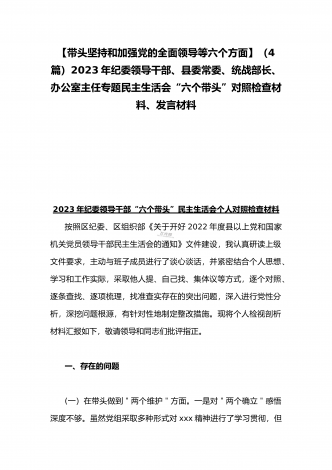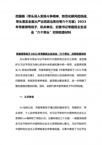 (带头深入发扬斗争精神,防范化解风险挑战、带头落实全面从严治党政治责任等六个方面)2023年机关单位、纪委书记、党委领导班子专题民主生活会“六个带头”对照检查材料[4篇供参考]