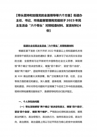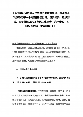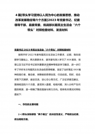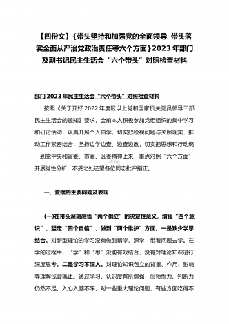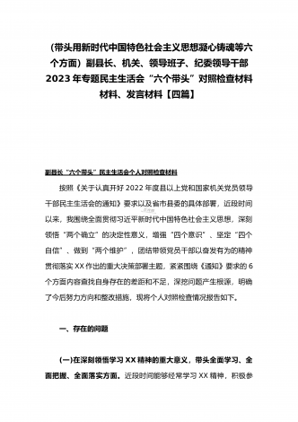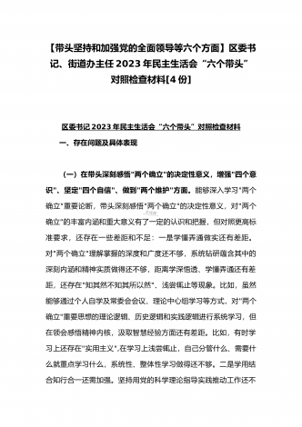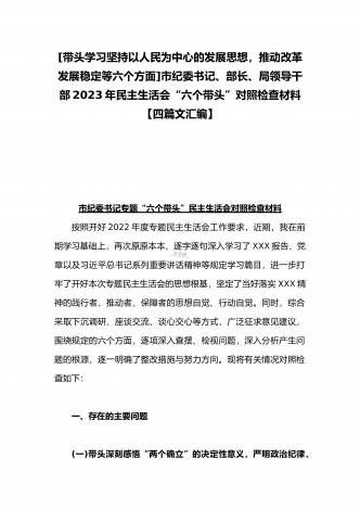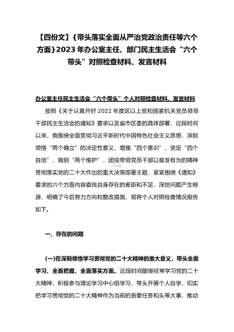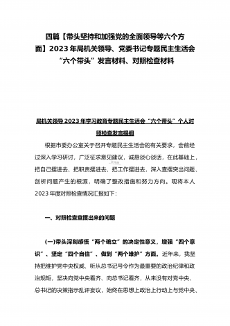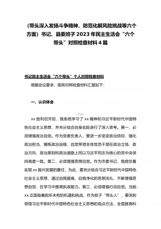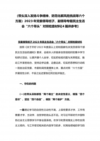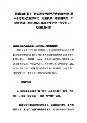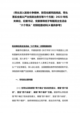 (带头深入发扬斗争精神,防范化解风险挑战、带头落实全面从严治党政治责任等六个方面)2023年机关单位、纪委书记、党委领导班子专题民主生活会“六个带头”对照检查材料[4篇供参考]机关单位民主生活会“六个带头”对照检查材料根据市纪委机关、市委组织部《关于开好2022年度县以上党和国家机关党员领导干部民主生活会的通知》要求,我紧扣这次会议主题,深入学习**精神,系统学习习近平新时代中国特色社会主义思想,在基础上紧密结合个人思想工作实际,围绕"六个带头"广泛征求意见、深入谈心谈话,全面查摆自身存在的差距...